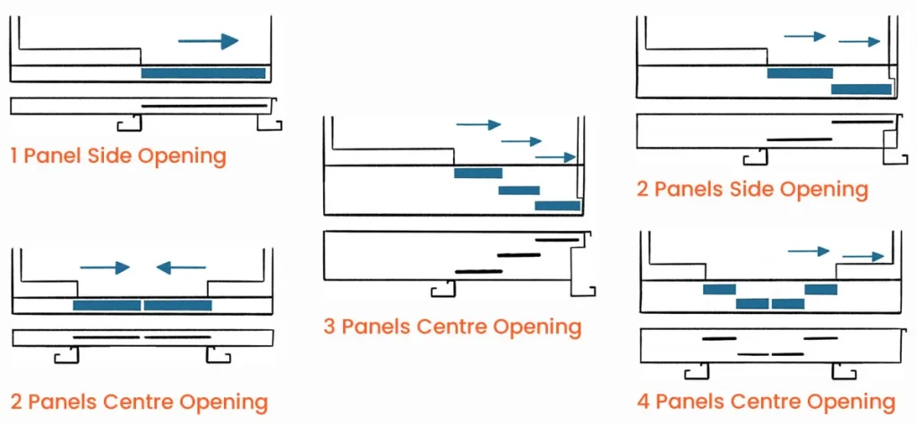 Please be aware that doors of any proper and certified elevator are designed and installed in such a way that the car cannot move when the landing door is open; which means when the elevator car say is on 5th Landing, only the 5th-floor landing door can open, while landing doors on all other floors are interlocked; be it manual door or automatic door. While the construction of manual door elevators is very simple, let us see how an automatic car door is constructed. The most common models (plan view) are shown in Figure 1. Here we can see one panel sliding doors, two-panel centre opening doors, and two-panel side opening doors (also popularly known as telescopic doors) They are made of fast-moving and slow-moving panels retracting on the same side. Opposite 4-panel (that is the combination of 2-speed doors and so one